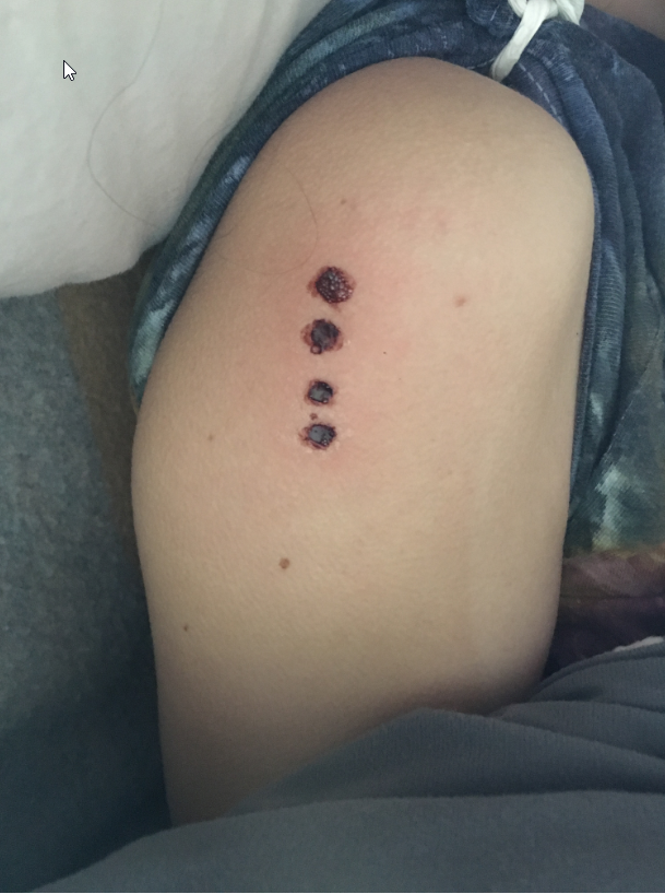 Kambo is absorbed topically into points created via small light burns to the top layer of skin. The fresh exposed layer of skin quickly absorbs the Kambo into the lymph system. Kambo works through the lymph system and so the dots are usually placed on the ankles shoulders or chest. The burns are very light and usually fade to invisible over the course of a 3-6 months or up to a year for rare skin types