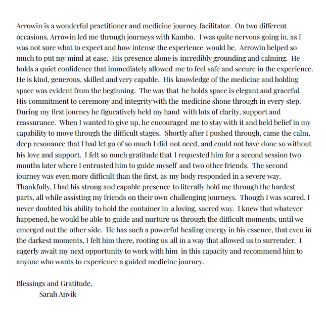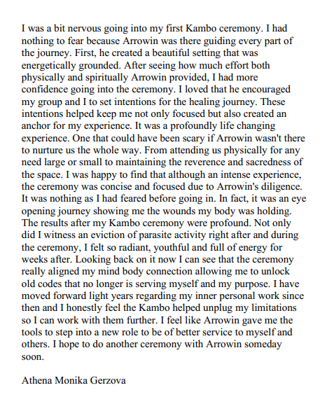 Kambo was an exhilarating feeling! Only one session and I felt the weight lifted off my shoulders. I felt lighter than a feather. My mind was clear, my body felt naturally energized! Arrowin made the process feel safe and warm and helped me through it all. I cannot wait to do more sessions in a new moon.
