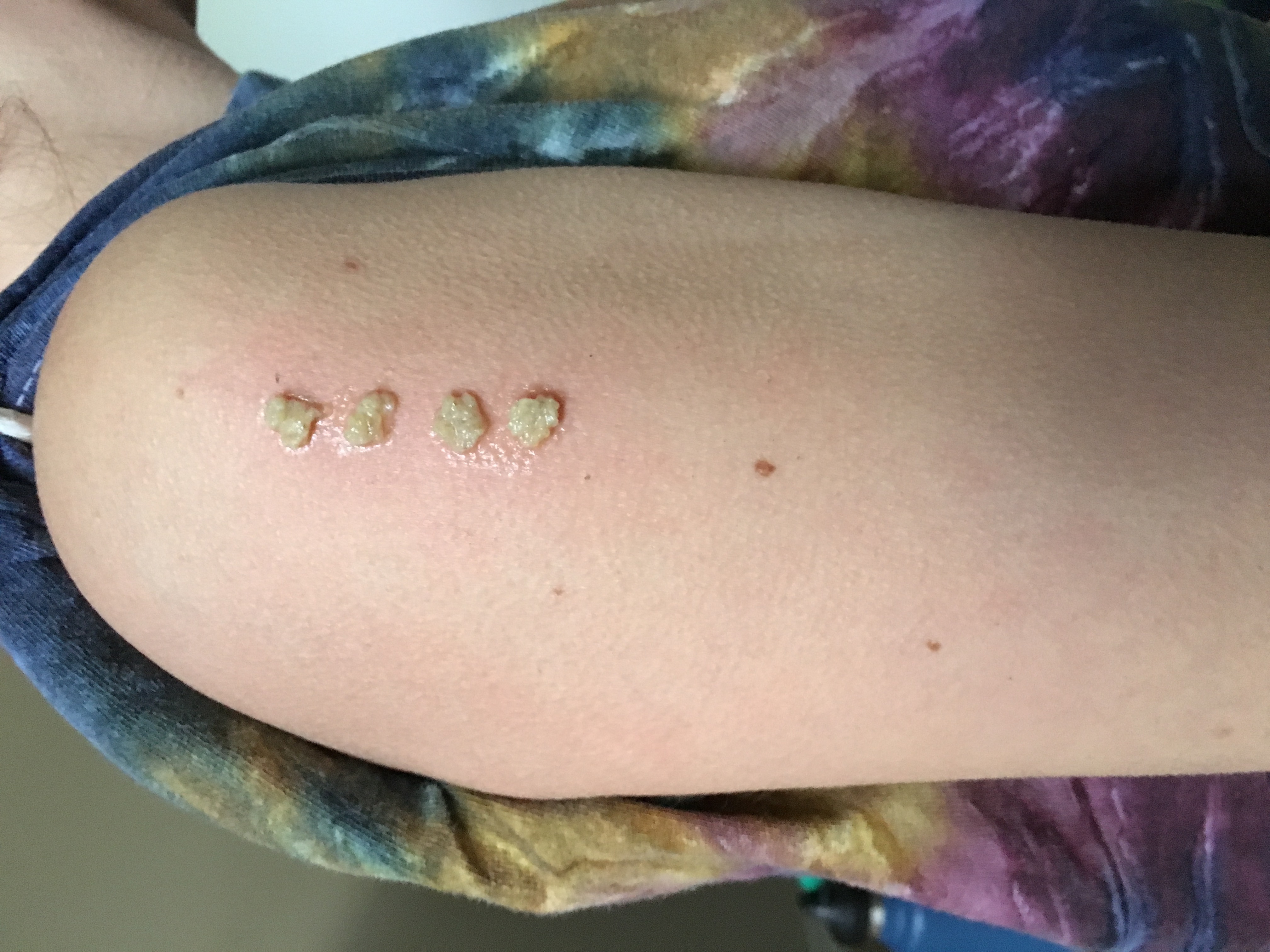 Kambo is absorbed topically into points created via small light burns to the top layer of skin. The fresh exposed layer of skin quickly absorbs the Kambo into the lymph system. Kambo works through the lymph system and so the dots are usually placed on the ankles shoulders or chest. The burns are very light and usually fade to invisible over the course of a 3-6 months or up to a year for rare skin types